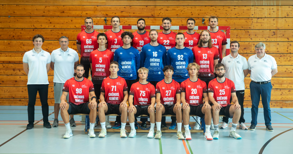 Milieu : Henry Cameron (président), Patrick Cazal (coach), Tom Weiler, Nolan Leoni, Andreas Wieser, Niks Lagzda, Victor Grillère, Renaud Goué (coach adjoint), Simon Aeschbacher (responsable sportif)