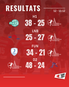 Compte rendu du match – BSV Stans – Chênois 25-27 Genève Handball – 13.12.2025 Victoire importante à l’extérieur pour le CS Chênois Genève Handball, qui s’impose 27–25 sur le parquet du BSV Stans au terme d’un match intense et longtemps indécis. Ce succès confirme la capacité de l’équipe à gérerContinuer la lecture