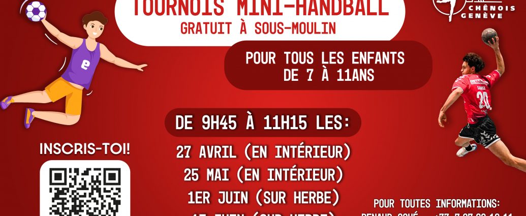 Gratuit à Sous-Moulin (Ouvert à tous) Le Chênois Genève Handball organise 4 tournois gratuits ouverts à l’ensemble des enfants âgés entre 7 et 11 ans ! De 9h45 à 11h15 le 27 avril et le 25 mai (en intérieur) puis le 1er et le 15 juin (sur herbe). Pour touteContinuer la lecture